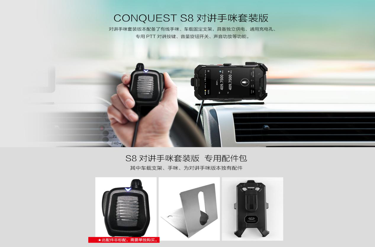 CONQUEST征服S8擁有智能雙對講系統(tǒng),2瓦U段全頻硬件無線定對講+全球PoC軟件網(wǎng)絡(luò)對講,對講直線距離可達(dá)5公里;支持手機(jī)與普通對講機(jī)進(jìn)行免費(fèi)通話和短信收發(fā)。 支持藍(lán)牙或有線對講手咪,并配有專用車載配件包。