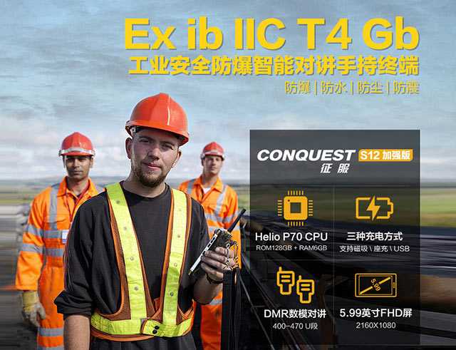 CONQUEST征服 S12工業(yè)防爆手機,不僅具有防爆功能,還擁有出色的防護性能,軍工IP68三防等級,具有防水、防震、防塵功能,有利于在嚴酷環(huán)境下正常使用。本質(zhì)安全型防爆,三防手機+防爆手機=專業(yè)的四防防爆手機。2W DMR數(shù)模一體對講,可滿足特殊環(huán)境下沒有網(wǎng)絡(luò)的情況下對講的需求。支持指紋識別功能,0.2S開系統(tǒng)。