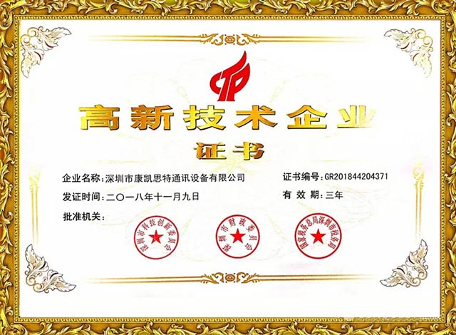 熱烈祝賀:深圳市康凱思特通訊設(shè)備有限公司榮獲"國家級(jí)高新技術(shù)企業(yè)"榮譽(yù)證書!