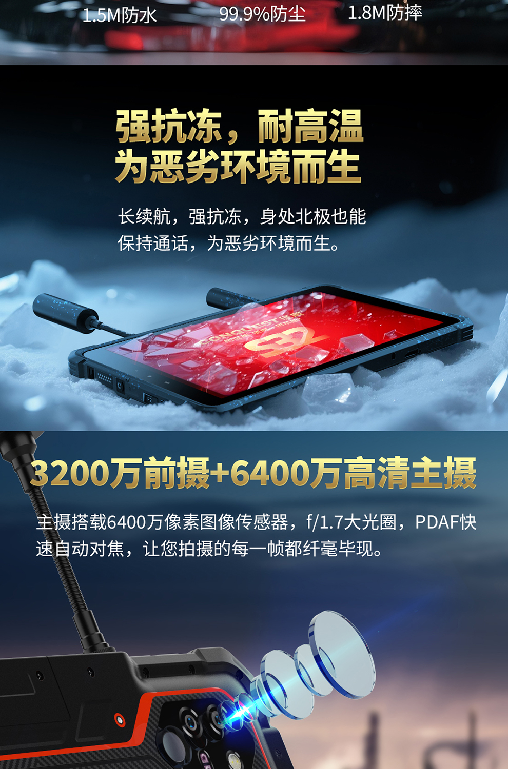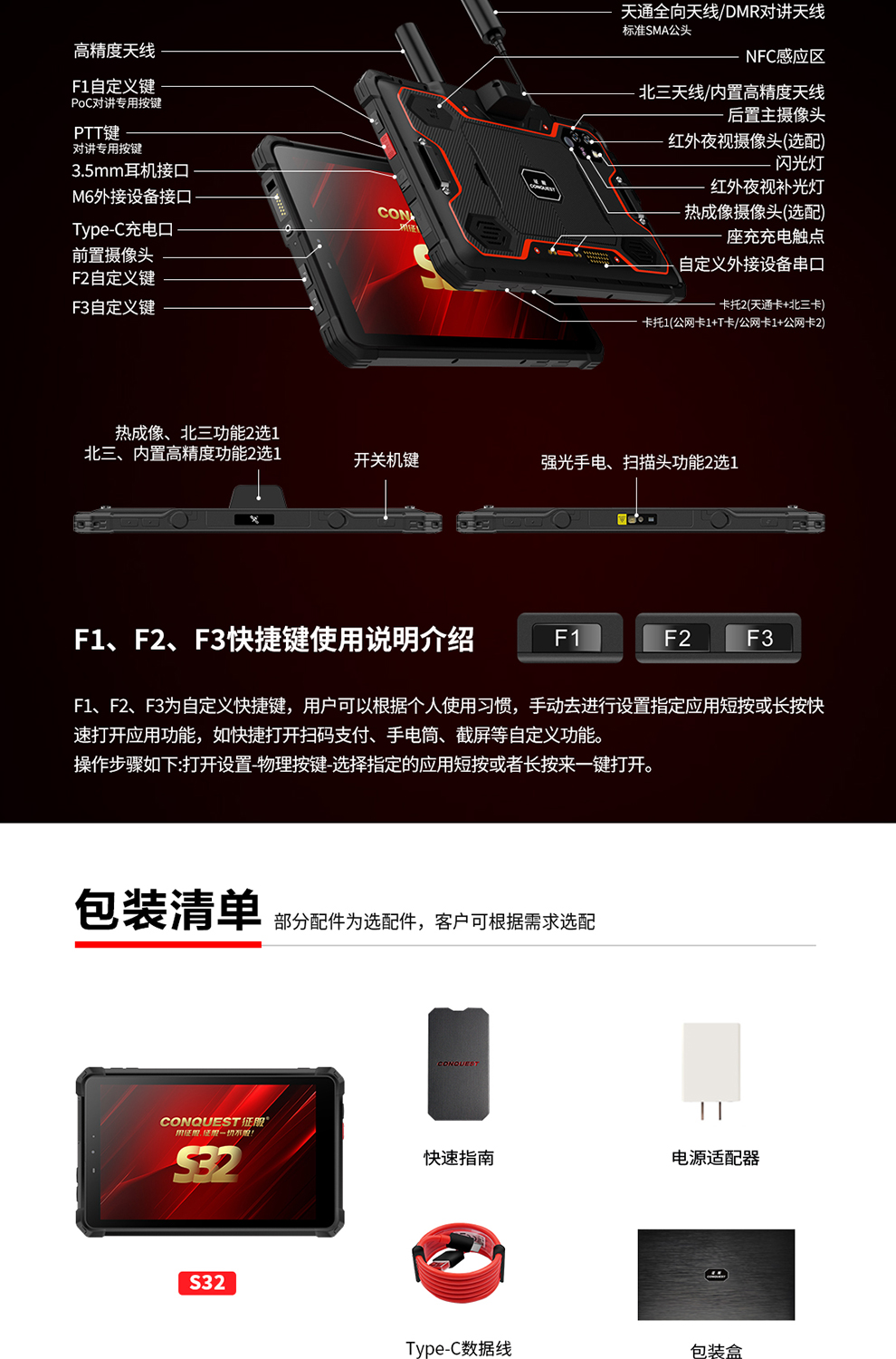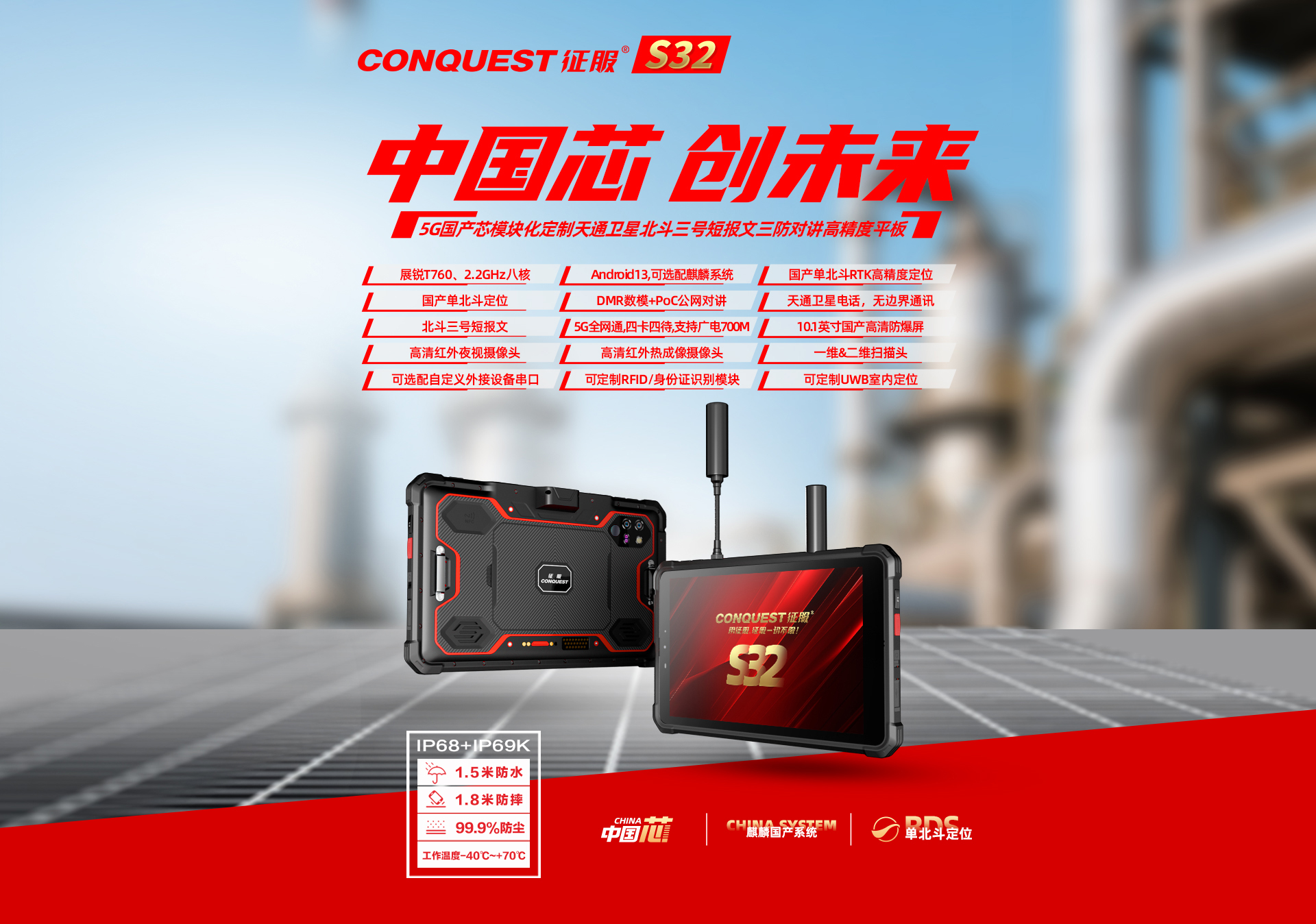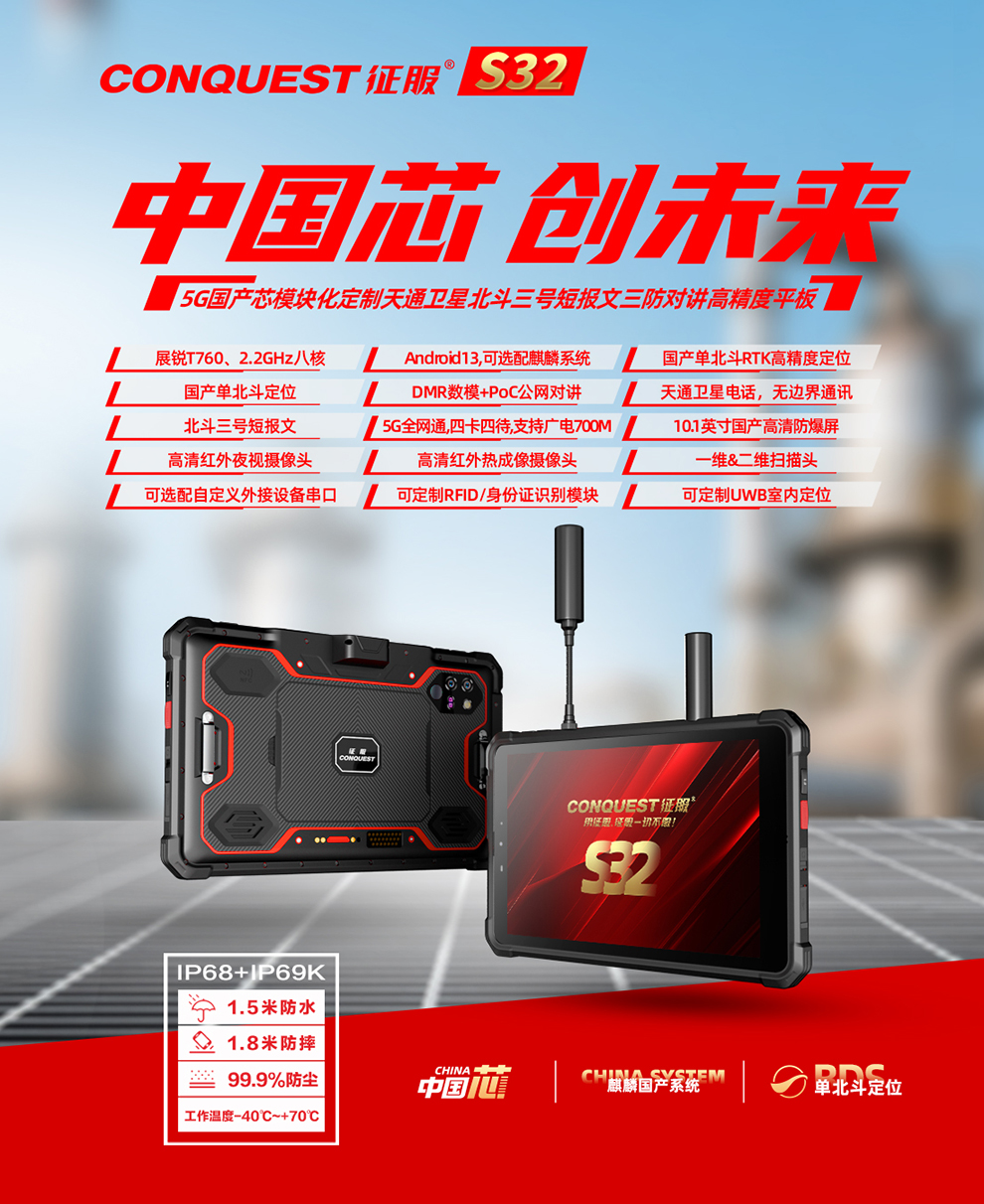 CONQUEST征服S32北斗短報(bào)文+天通衛(wèi)星電話+DMR對(duì)講,5G單北斗高精度定位三防智能平板終端!
