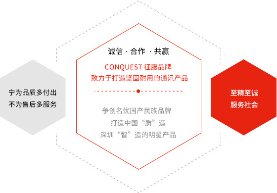 深耕行業(yè)數(shù)年,CONQUEST征服始終秉承以客戶需求為核心,追求多元化經(jīng)營模式;遵循“寧為品質(zhì)多付出、不為售后多服務(wù)”的品質(zhì)理念;“配置躍然升級,征服永不止步”的產(chǎn)品理念;貫徹“致力應(yīng)急 專于通信 服務(wù)至上 互利共贏”的企業(yè)宗旨;“用征服,征服一切不服”的企業(yè)精神,致力于打造堅固耐用的三防智能通訊產(chǎn)品和中國“質(zhì)”造、深圳“智”造的明星產(chǎn)品。